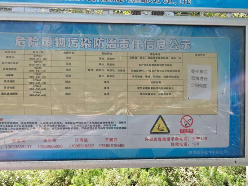 我濰坊碩邑化學(xué)有限公司現(xiàn)有危險(xiǎn)廢物八種,分別為廢活性炭(HW49  900-039-49)、乳化劑等助劑包裝物(HW49  900-041-49)、油漆桶(HW49  900-041-49)、廢試劑瓶(HW49  900-041-49)、化驗(yàn)室廢液(HW49  900-047-49)、廢機(jī)油桶(HW08  900-249-08)、廢機(jī)油(HW08  900-214-08)、廢過(guò)濾吸附物(HW49  900-041-49)。